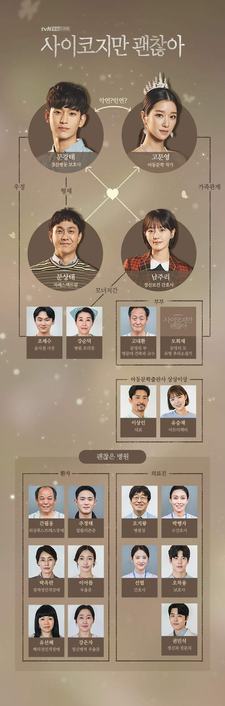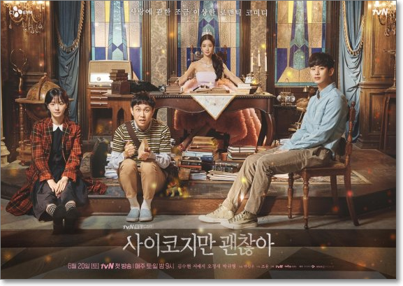 사이코지만 괜찮아는 버거운 삶의 무게로 사랑을 거부하는 정신 병동 보호사 강태와 태생적 결함으로 사랑을 모르는 동화 작가 문영이 서로의 상처를 보듬고 치유해가는 한 편의 판타지 동화 같은 사랑에 관한 조금 이상한 로맨틱 코미디입니다.