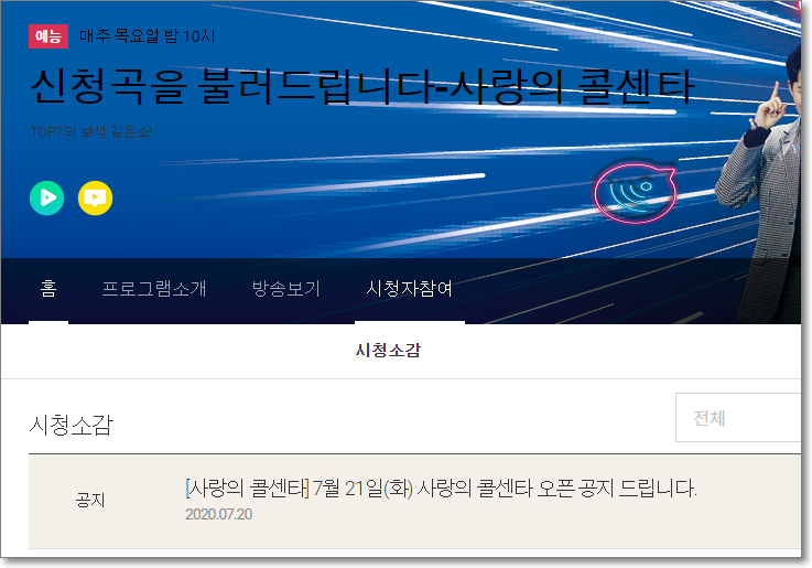 TV 조선 사랑의 콜센타 홈페이지에 접속해서 시청 소감 공지를 통해 사연 신청 날짜를 확인해야 하는데요.