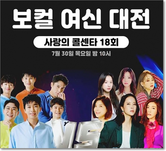 '사랑의 콜센타' TOP6와 가요계 보컬 여신6가 보컬 강자의 자리를 두고 펼치는 '여신6 특집'이 가동됩니다. '사랑의 콜센타'는 여름특집 제3탄으로 현역7보다 더욱 막강한 상대로 구성된 '여신6 특집'을 마련했는데요.