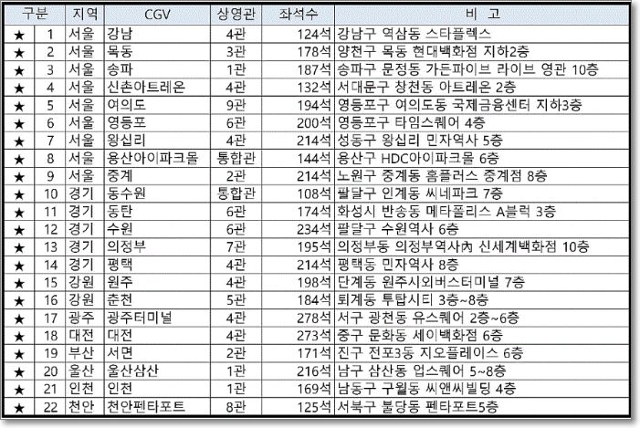 22곳 CGV에서 상영하며 서울, 경기, 강원, 광주, 대전, 부산, 울산, 인천, 천안 등에서 관람할 수 있습니다.