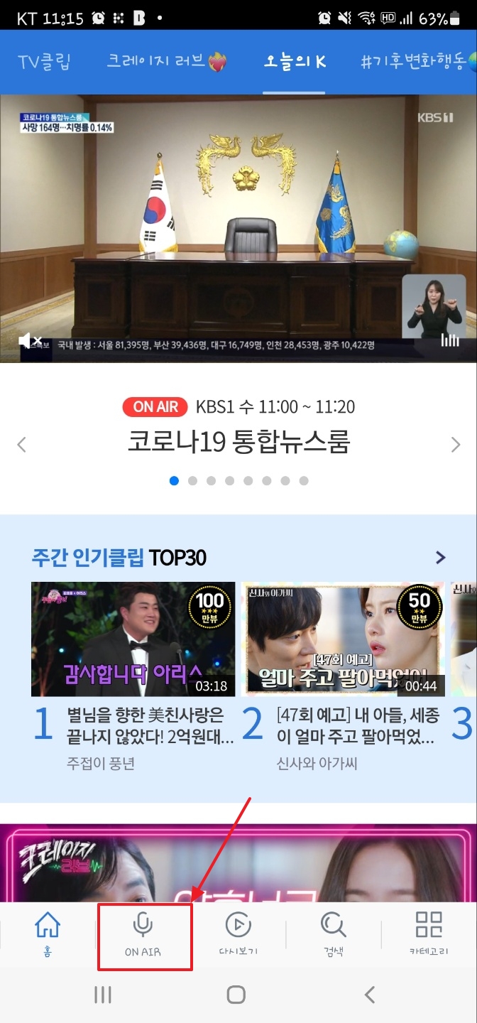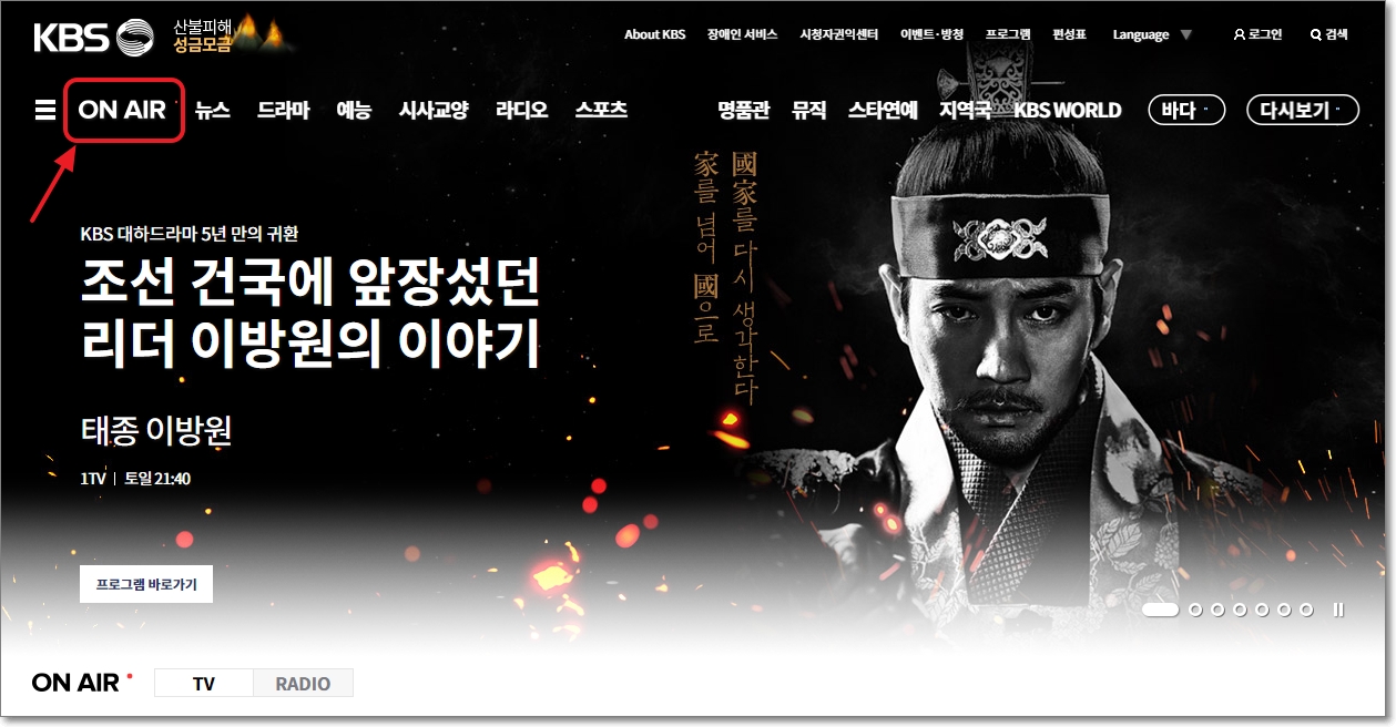 메인 홈페이지에 들어가셨다면 좌측 상단 위 화면에서 보이는 빨간색 표시 ON AIR을 클릭하세요.
