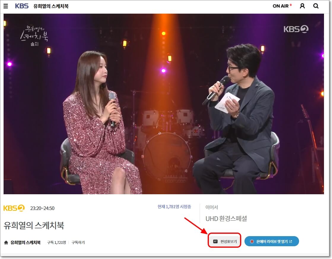현재 방송 프로그램 외에 다른 시간대에 어떤 방송을 하는지 궁금하시다면 위 화면에 나온 편성표 보기를 눌러보시면