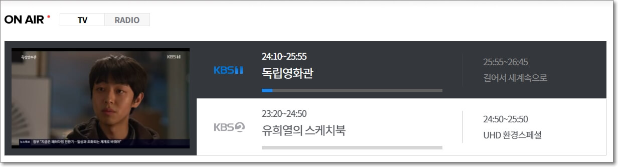 KBS 홈페이지 메인화면에서 약간 아래로 스크롤하시면 작은 화면으로 실시간으로 방송중인 방송이 보여지는데요.
