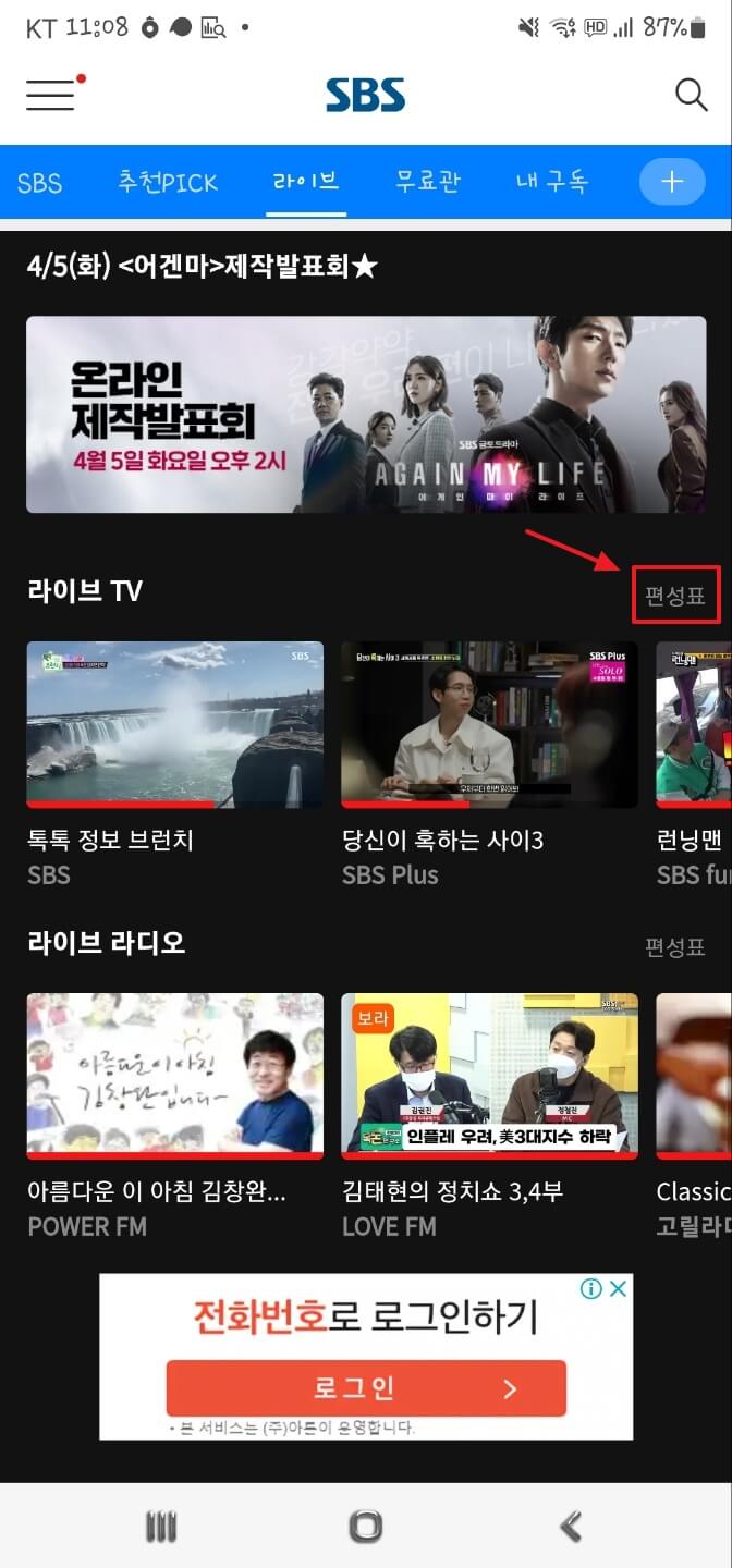 앱을 다운받아 설치한 후에 실행을 시키면 아래와 같은 화면이 나오는데요. 여기에서 상단 메뉴에 있는 라이브를 선택하면 PC에서와 마찬가지로 해당 시간에 방송하는 실시간 방송을 시청할 수 있습니다.