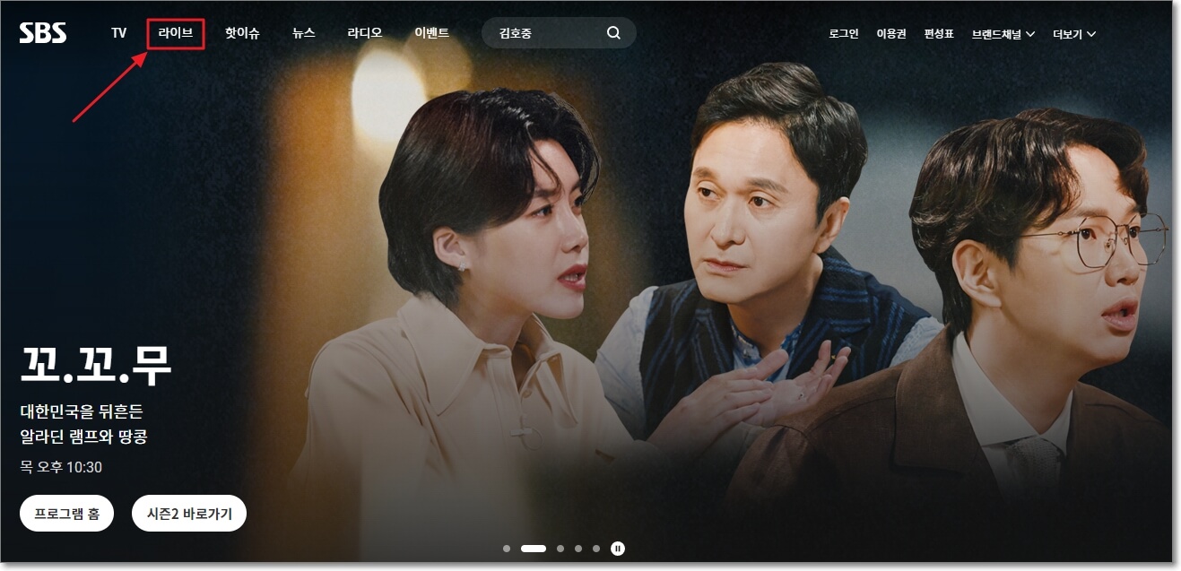 홈페이지에 접속하면 메인 화면이 나오는데요. 메인화면에 좌측 상단에 있는 메뉴 중 '라이브' 탭이 있습니다. '라이브'를 클릭해 주세요.