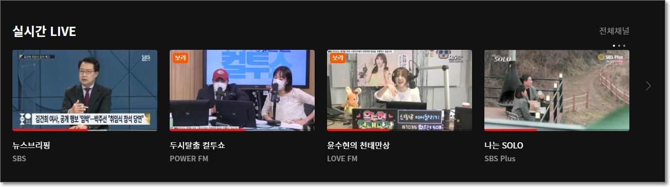 라이브를 클릭하면 클릭한 시간대에 실시간으로 하는 방송 정보가 나오는데요. SBS 뿐만 아니라 SBS관련 채널 프로그램도 실시간으로 시청할 수 있습니다. SBS에서 운영하는 채널마다 실시간 LIVE 방송을 시청할 수 있습니다.