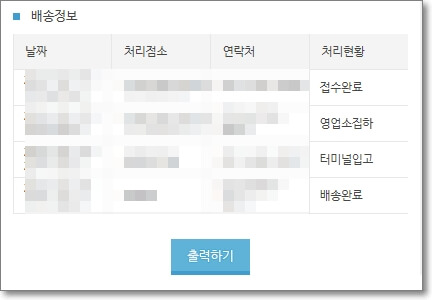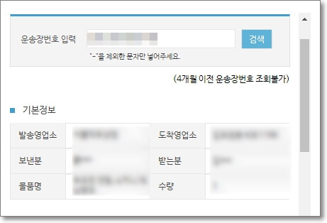 여기에서 미리 적어놓은 운송장 번호를 입력하고 검색버튼을 클릭하시기 바랍니다. 최근 3개월까지는 조회가 가능하지만 4개월이 넘어가면 조회가 불가능 하다고 합니다. 운송장 번호는 '-'을 제외하고 입력하시면 됩니다. 우선 제가 최근 받았던 물건 운송장 번호를 입력해 봤습니다.