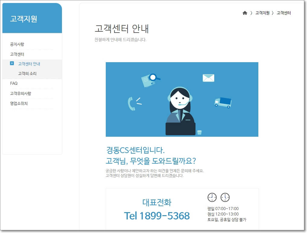 만약 운송장번호로 배송조회를 했는데 자세한 정보를 알 수 없거나 확인되지 않는다면 고객센터에 문의를 해야 하는데요. 고객센터 지원관련 정보는 위 화면에서 확인하시면 됩니다. CS 운영시간은 평일 오전 7시부터 오후 5시까지 운영하고 토요일이나 공휴일은 운영을 하지 않는다고하니 이용하실 때 참고하시면 될 것 같습니다.