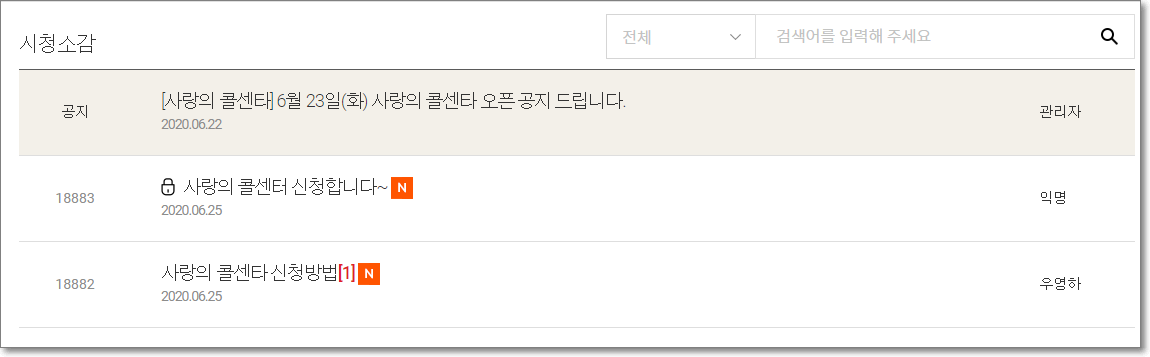 홈페이지 접속 후 시청자참여 -> 시청 소감을 누르면 사랑의 콜센타 오픈 공지를 아래와 같이 확인할 수 있습니다. 보통 공지는 한달에 2회정도 되며 첫 주와 셋째주 일요일 또는 월요일에 올라옵니다.