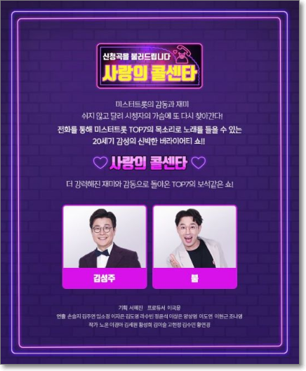 신청곡을 불러드립니다 사랑의 콜센타는 매주 목요일 저녁 10시에 방송됩니다.